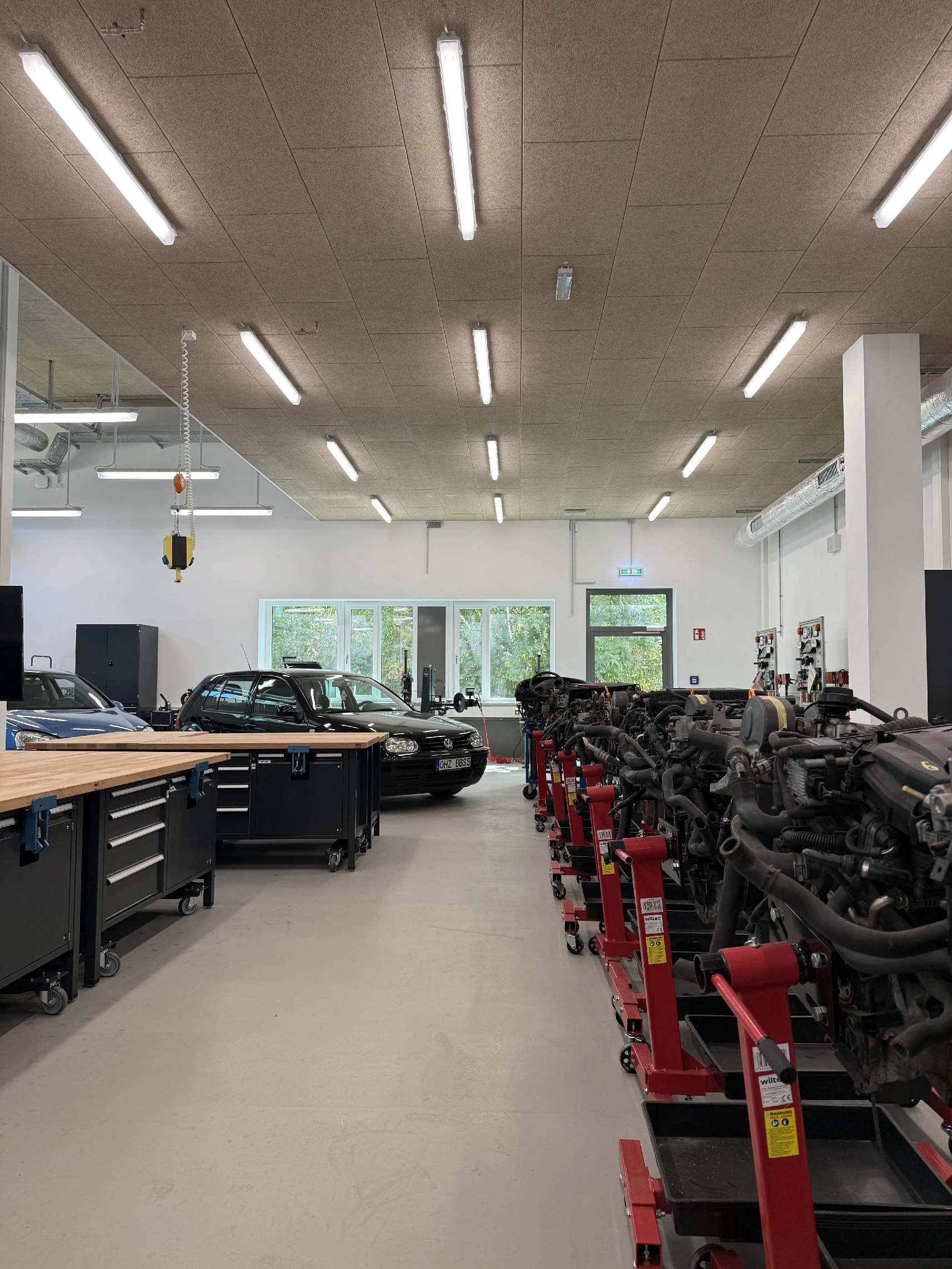 Für den Fachbereich Sozialpädagogik gibt es neben offenen Lernbereichen und Unterrichtsräumen zum Beispiel auch zwei Kreativwerkstätten, einen Musikraum und einen Psychomotorikraum. Der Fachbereich Pflege hat Fachräume für häusliche und stationäre Pflegepraxis, eine Hauswirtschaftsküche sowie einen Wäschepflegeraum bekommen. Und im Erdgeschoss tüfteln die KfZ-Mechaniker in einer modernen Werkstatt, einem Diagnose-Labor und einem Labor für Elektromobilität, für das eigens 2 E-Fahrzeuge angeschafft wurden.